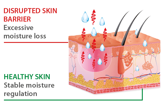 When the skin barrier is disrupted, the body loses an abnormal high volume of water through the skin. This will result in a decrease of the normal water percentage in the epidermis, causing the skin barrier to disfunction. This vulnerable skin is unable to heal and protect itself.